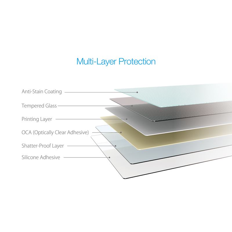 Ścianki szkła wykończone jedwabistą czernią. Samoprzylepna warstwa o twardości 9H chroni twój wyświetlacz przed zadrapaniami.
