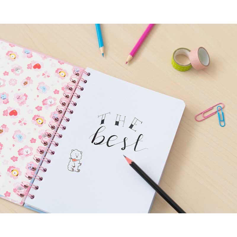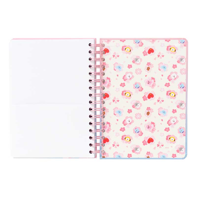 Zápisník A5 v tvrdých deskách s motivem Lined Friends BT21 s personalizovanými vnitřními i vnějšími deskami, kulatými rohy, drátěnou vazbou, zavíráním na gumičku a vnitřní kapsou.
