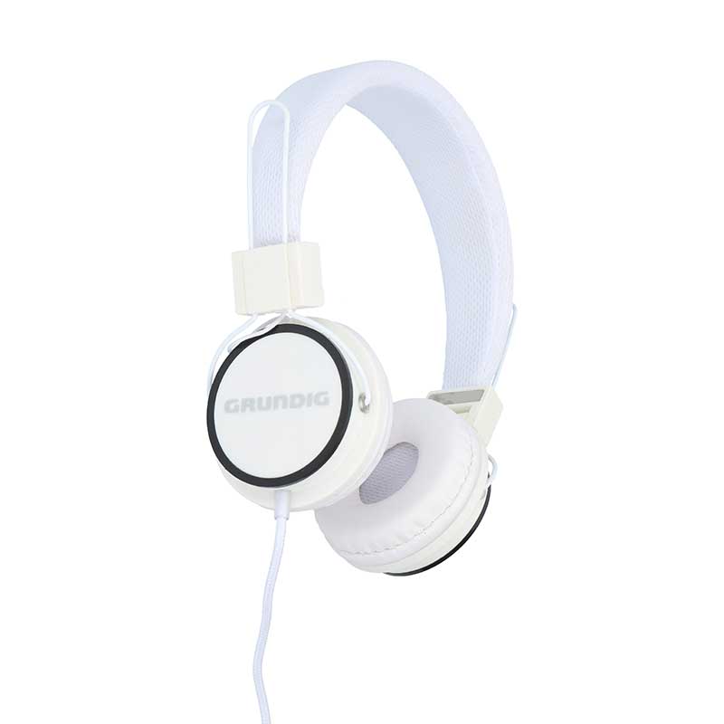 Auriculares estéreo de Grundig en blanco. Proporcionan un sonido cristalino y unos graves ricos. Harán que su tiempo mientras hace ejercicio, trabaja o juega sea más agradable.