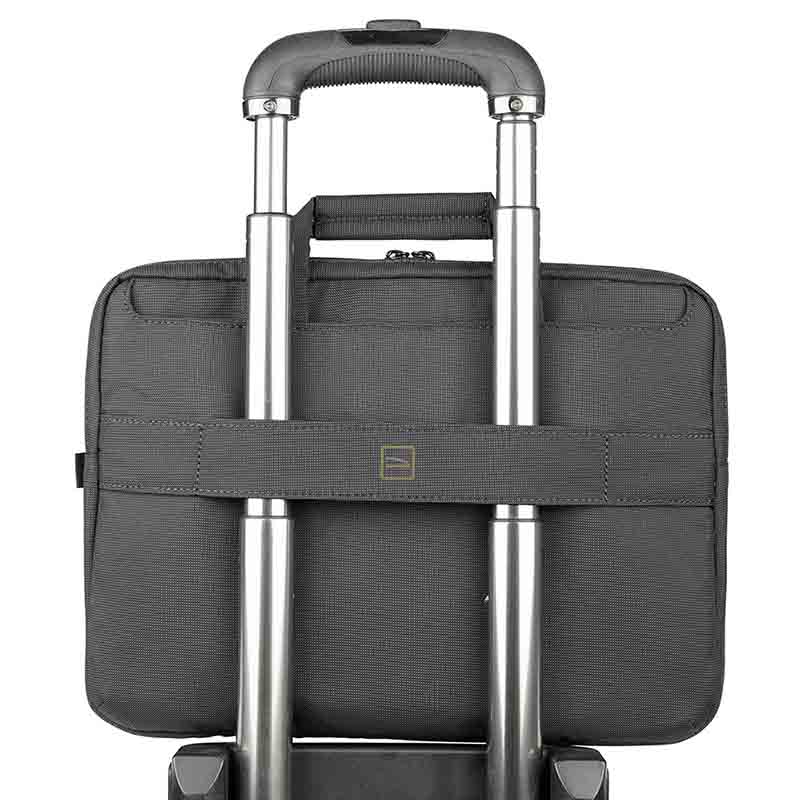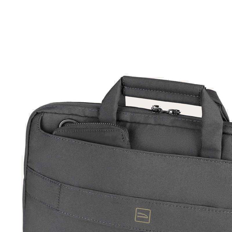 Biznesowa torba do bezpiecznego i wygodnego przenoszenia MacBook Pro 14" / laptopa 13", która pozwala się przekształcić ze średniej wielkości torby w dużą. Wykonana została z tkaniny wyprodukowanej z plastiku pochodzącego z recyklingu.