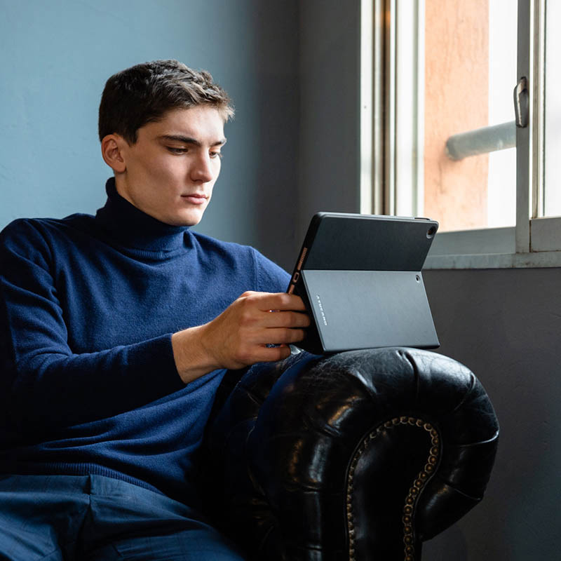 Case for the 2022 10th generation 10.9” iPad featuring a semi-rigid back shell and anti-scratch interior. The cover turns into a practical and convenient stand that lets you use your iPad in a variety of positions. Inside the cover there is a special space to store your Apple Pencil. There is also a camera opening on the back and built-in on off function.