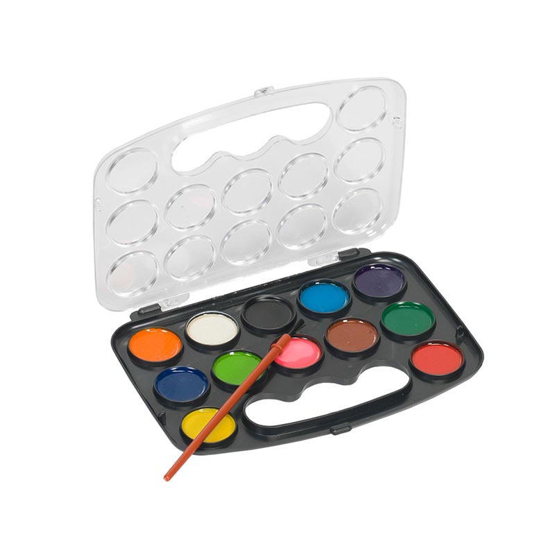 The set with plastic palette contains 12 colours of pastille paints and a brush. The colours can be mixed together and diluted with water to create different shades.