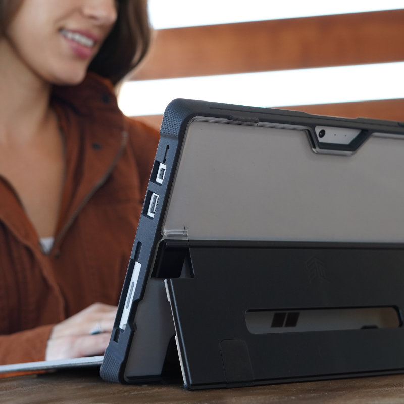 Pancéřové pouzdro STM Dux Shell nabízí jednu z nejvyšších úrovní ochrany pro Microsoft Surface Pro 7+ i starší modely Pro 4/5/6/7 a je navrženo tak, aby splňovalo přísnou normu MIL-STD-810H pro odolnost proti pádu z velké výšky. Texturovaný nárazník pohlcuje nárazy a díky svým protiskluzovým vlastnostem výrazně zlepšuje kvalitu uchopení.