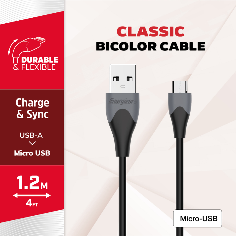 Kabel Energizer Classic do ładowania i transmisji danych o długości 120 cm, wyposażony w złącze USB-A na Micro USB.