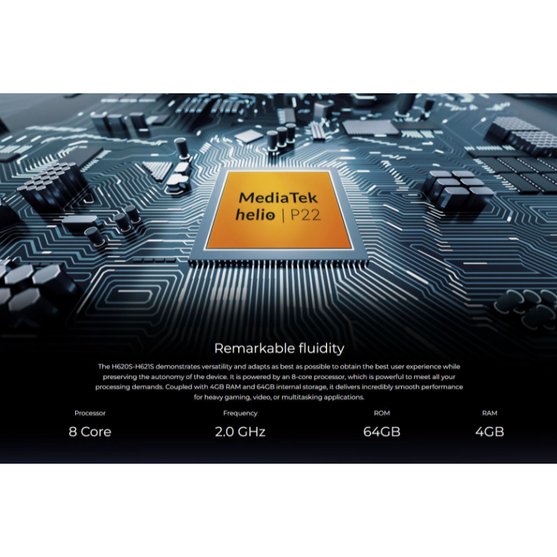 El H620S demuestra versatilidad y se adapta lo mejor que puede para ofrecer la mejor experiencia manteniendo la autonomía del dispositivo. Cuenta con un procesador MediaTek MTK6762V/WB de 8 núcleos, potente para satisfacer todas las necesidades de procesamiento. Combinado con 4 GB de RAM y 64 GB de memoria interna, ofrece un rendimiento increíblemente fluido en juegos pesados, vídeo o aplicaciones multitarea.