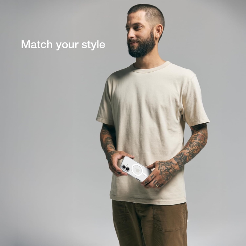 Wykonane z poliwęglanu i TPU pochodzących z recyklingu, etui łączy lekkość z wyjątkową trwałością, jednocześnie zapewniając pełny dostęp do wszystkich portów i przycisków. Matowe wykończenie boków i przycisków nie tylko zwiększa komfort użytkowania, ale także zapobiega wyślizgnięciu się telefonu z dłoni.