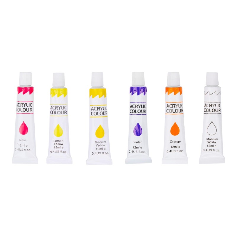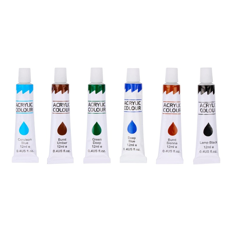 · 12 intensywnych kolorów akrylowych po 12 ml – trwałe, żywe i kryjące barwy.
