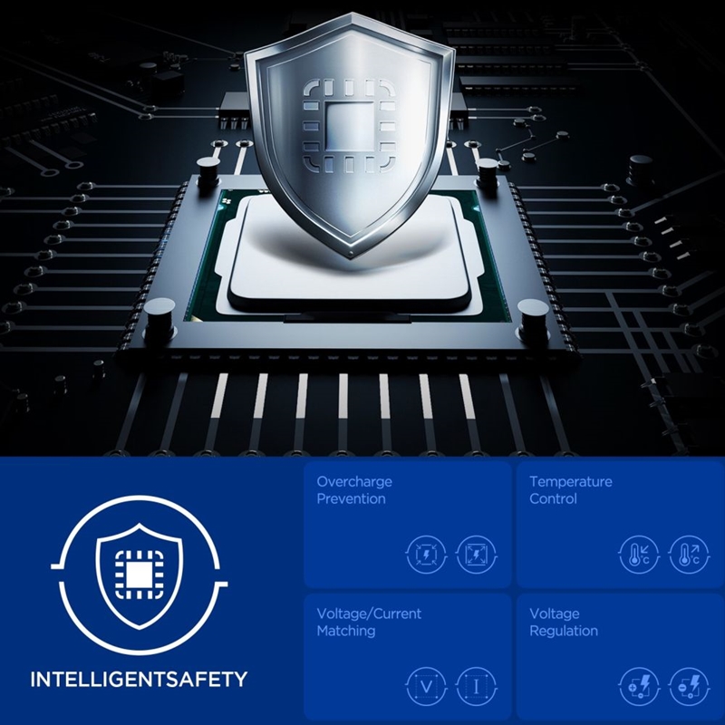 Zastosowana technologia Quantum Boost automatycznie dobiera parametry ładowania do urządzenia, maksymalizując efektywność i skracając czas ładowania. Za bezpieczeństwo odpowiadają zaawansowane systemy ochrony – Overcharge Prevention, Voltage Matching i Voltage Regulation – które chronią sprzęt przed przeładowaniem, nieprawidłowym napięciem i nadmiernym prądem.